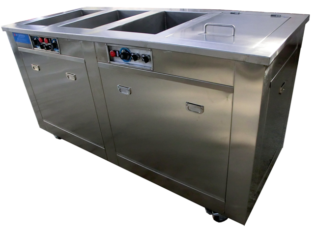 一二三四多功能槽式超声波清洗机,该设备由四个槽组成,第一、二槽为超声波槽,超声波发生器内置(超声波电源)和超声波清洗槽(粘接超声波换能器)。超声波发生器将工频电能转变成28KHz的高频电信号,通过高频电缆输送到超声波换能器上,换能器被加上高频电压后,产生强有力的超声振动,在液体中迅速传播,作用于超声波清洗槽内液体介质中,产生每秒2.8万次以上的振动,从而将工件附着的污垢震落,达到清洗目的,第三槽为鼓泡漂洗槽,通过进一步的漂洗,可以将已经被超声波轰击下来,微附在工件上的颗粒粉末,通过漂洗掉落在液体中。第四槽为烘干槽,内置热风烘干,使产品达到干燥的目的。 一二三四多功能槽式超声波清洗机包括 |