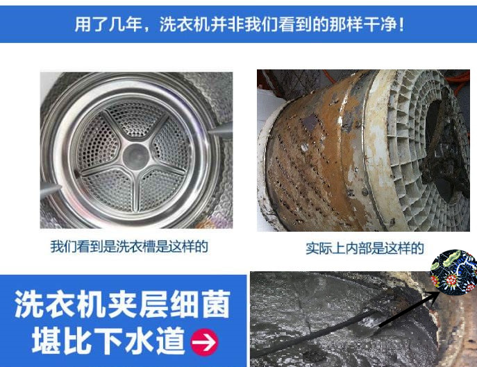 洗衣机的洗涤剂盒和滚筒门圈,只要平时注意使用时稍加注意,定期进行手动清洁,用热水清洗料盒,倒掉残留的洗涤剂,冲刷干净,保持干燥即可,真正藏污纳垢最多的地方,就是滚筒。洗衣机的内筒一般采用不锈钢材质,衣服通过与筒壁的摩擦起到去污的效果,即使是使用了一年也显得十分光亮。但在看似干净的内筒背后,是不是暗藏着很多污渍和细菌呢?平时洗涤衣物使用的金属层称之为内筒,在外层还有一层塑料或其他材质的外筒相套,在内外筒之间的夹层,就是藏纳污垢滋生细菌的洗衣机槽了。 洗衣服的过程中,污水从内筒的排水孔排出,有一段时间会停留在内槽内,而排水的速度又不是很快,日积月累,内槽自然容易留下污垢。洗衣机的夹层就像个下水道,附着有水垢、洗衣剂游离物、衣物纤维、人体其他有机物及衣物带进的细菌等等,如果不及时清理,这些附着在夹层内的杂物会发酵、滋生细菌,直接危害人体的皮肤和生殖系统,据上海市疾病预防控制中心调查发现,使用一年以上的洗衣机槽内,存在着深红酵母、绿脓杆菌、指甲隐球菌等大量病菌。细菌超标率为81.3%,霉菌检出率为60.2%,总大肠菌群检出率高达100%。因此新买的洗衣机使用半年后,及以后每隔三个月都应清洗一次。