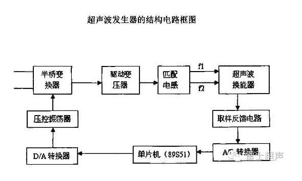 双频超声波清洗机的优点,双频超声波发生器,能产生两种频电提供给超声波换能器,超声波换能器工作在基频28KHz和倍频56KHz的谐振频率上,这两种频率的超声波在液体中传播所产生的波节和波腹,具有互补效应,不仅有效地消除清洗槽内驻波的影响,而且无论工件大小,结构简单或复杂,都可以获得更好的清洗效果。 双频超声波发生器包括硬件电路和软件设计两方面。硬件电路包括模拟驱动电路和信号产生及频率跟踪电路两部分,超声波发生器的信号产生及频率跟踪电路是分时产生两种具有超声频的电信号,超声波发生器的模拟驱动部分是对由信号产生及频率跟踪电路产生的电信号进行功率放大,然后将放大的电信号加在超声波换能器的两电极端。软件设计包括分时产生两种产生频电信号和跟踪超声波换能器的固有频率变化,并且根据超声波换能器变化的固有频率来适时调整输出电信号的频率。软件设计的重点在于选择超声波换能器谐振频率的跟踪方式。 双频超声波发生器电路结构 模拟电路部分包括:半桥变换器、驱动变压器、匹配电感。半桥变换器是一种超声波放大器,其作用是产生某一频率和功效的交流电驱动超声波换能器,为超声清洗提供电能,这种逆变器多采用大功率桥式变换电路,桥式变换器的开关一般是双极性品体管或场效应管,场效应管必须具有适应高频工作的特点,高频变压器则通过匝比设计控制放大器输出功率大小,匹配电感是对超声波换能器进行动态匹配,以便提高超声波换能器的电声转换效率。 信号产生及频率跟踪电路:主要是超声频率信号发生电路和超声波换能器谐振频率的跟踪电路。它包括:超声波换能器的电流取样反馈电路、A/D转换器、单片机(89S51)、D/A转换器和压控振荡器。取样反馈电路是一个具有一定阻值的电阻,这个电阻同超声波换能器串连,它两端的电压值能反应流经超声波换能器的电流大小,当超声频电信号的频率等于超声波换能器的固有频率时,超声波换能器工作在谐振状态,此时,流过超声波换能器的电流最大,反应在取样电路两端的电压也最大;A/D转换器是对来自取样电路的模拟信号进行模数转换,因为单片机只能接收数字信号,故采样后的模拟信号必须转换成数字信号后,才能被单片机接收;单片机(89S51)对采样号进行分析处理,输出一个控制信号,控制压控振荡器的输出频率;D/A转换器是对来自单片机的控制信号进行数模转换,输出一定大小的模拟电压信号;压控振荡器由脉宽调制器GS3525构成,它能根据来自D/A转换器输出的电压信号,产生一定频率的超声频电信号。