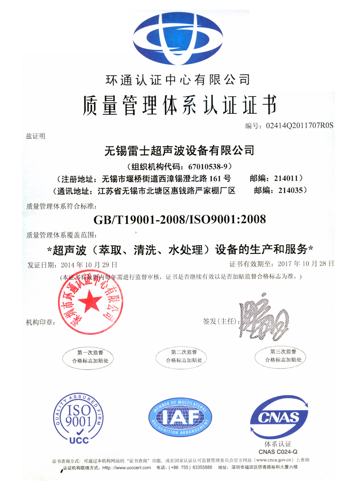 热烈祝贺无锡雷士超声波设备有限公司,获得ISO9001质量管理体系认证,综合各方面的考核,对产品的生产检验,原材料的各种检测,以及设备生产流程的监控,我公司在领导的带领下,通过了第一阶段和第二阶段的严格审核,在超声波清洗机的生产能力和设备管理中通过验收,对生产的关键过程和能力考评顺利通过验收,各项标准符合GB/T19001-2008/ISO9001:2008标准,我公司产品体系覆盖超声波清洗、超声波萃取、超声波水处理的生产和服务,今后我们将以此为契机,使超声波清洗机产品更上一层楼。 |
